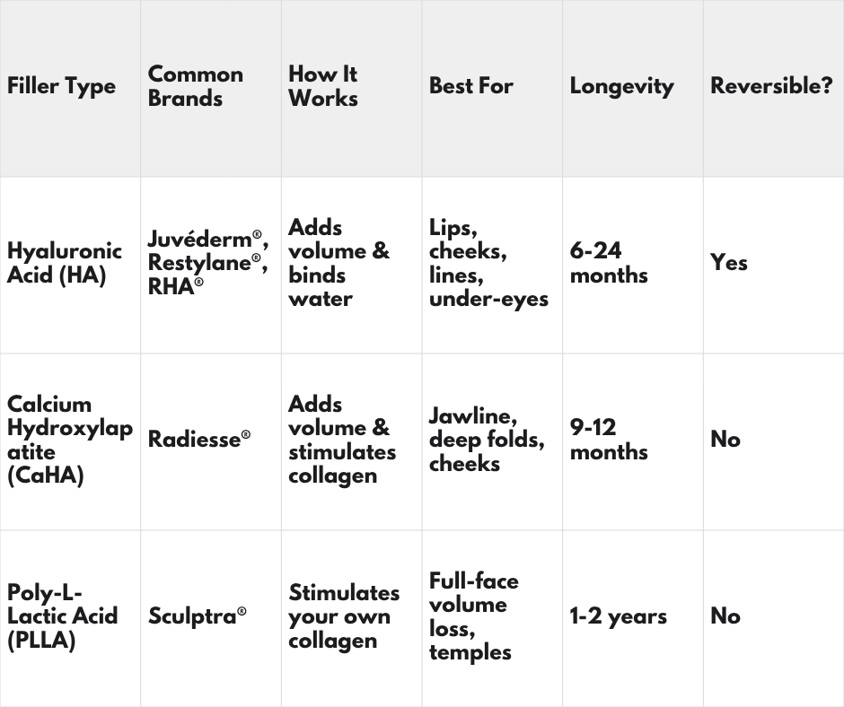 Fillers are categorized by the substance they are made from. Here are the most common types you'll find at our med spa.
